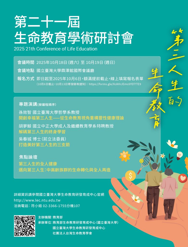 說 明: 一、 本校生命教育研發育成中心將於114年10月18日至19日舉辦「第二十一屆生命教育學術研討會」,希冀透過專題演講、論文發表和焦點論壇等方式進行交流對話,深化生命教育相關議題探討,促進生命教育之學術研究與教學推廣。 二、 本屆會議主題為「第三人生的生命教育」。報名資訊如附件,最新消息請至本校生命教育研發育成中心官網查詢(http://www.lec.ntu.edu.tw)。